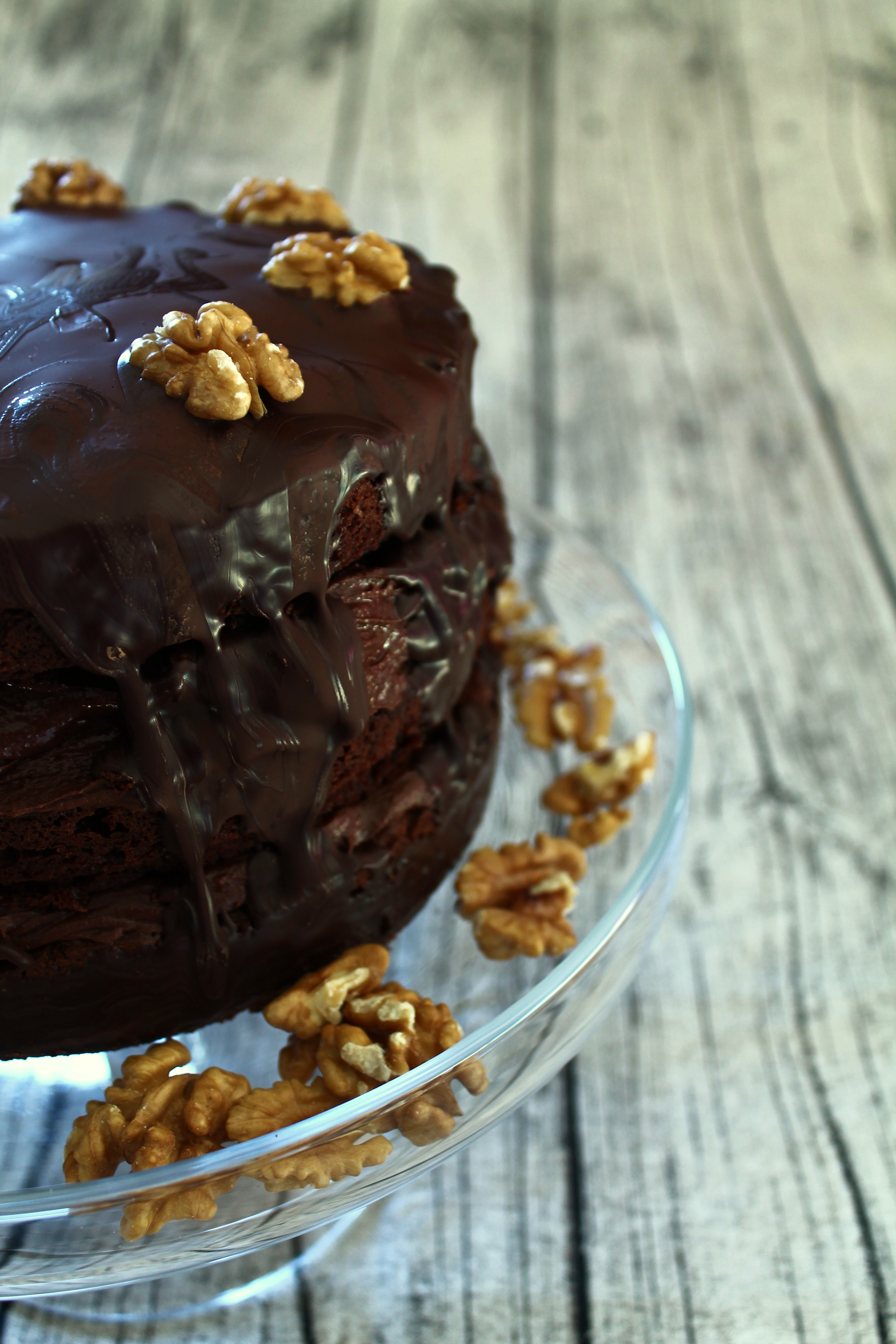 – wer mag, kann jetzt noch Walnusshälften oben auf den Schokoguss drapieren