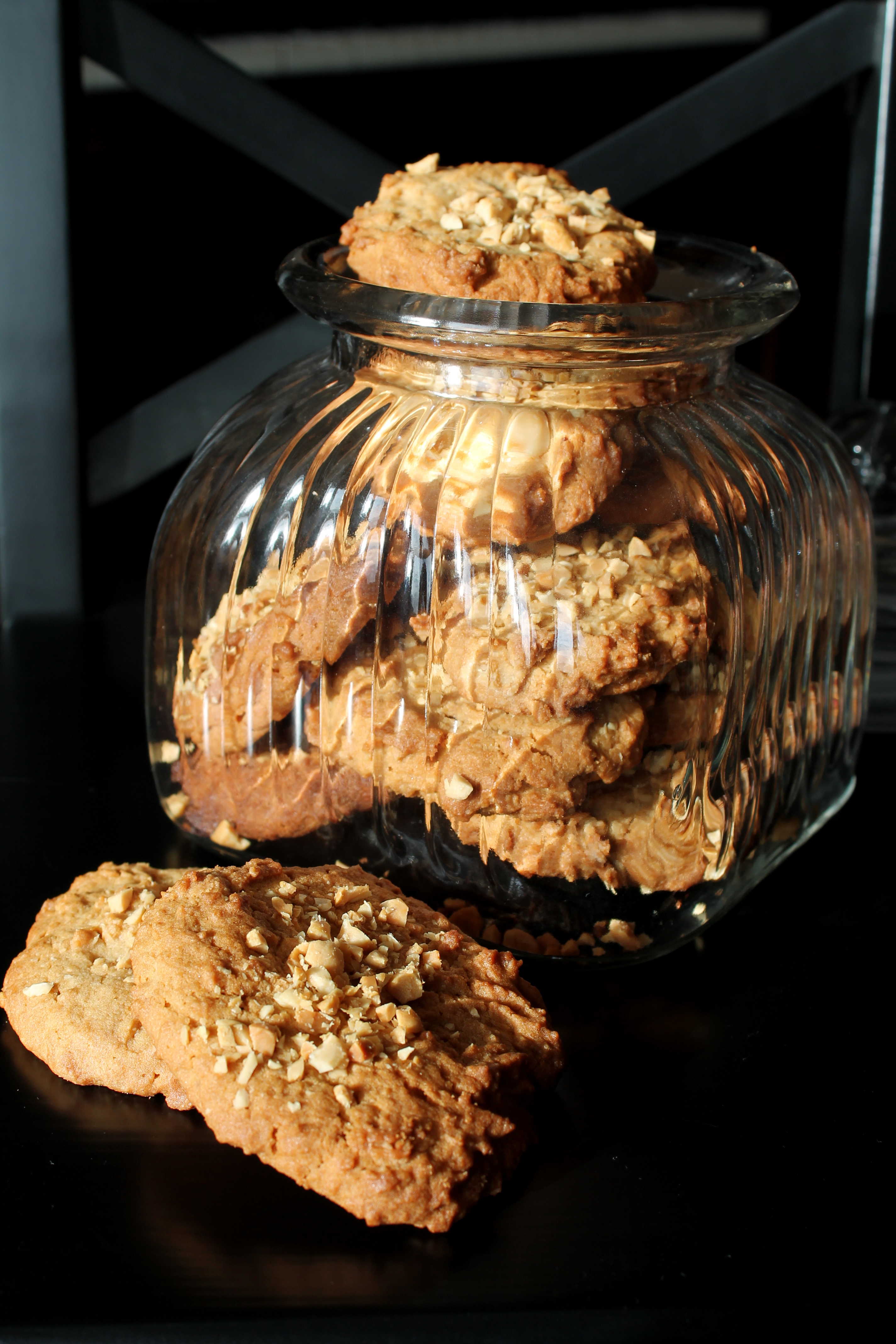 – jetzt den Teig mit einem Esslöffel auf die Bleche klecksen, etwas plattdrücken, dann die gehackten Erdnüsse draufstreuen und sie leicht festdrücken